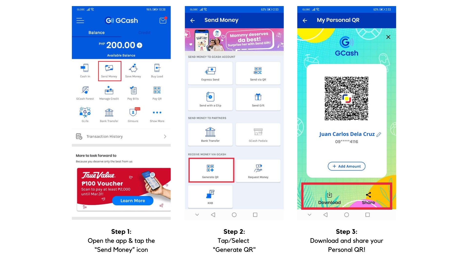 - Allows users to securely send and receive money without having to worry about “wrong sends” due to incorrect numbers, or giving away personal information such as their mobile numbers. Users can easily generate their own Personalized QR code and use this in place of giving their GCash number — perfect for either small businesses or personal use.
